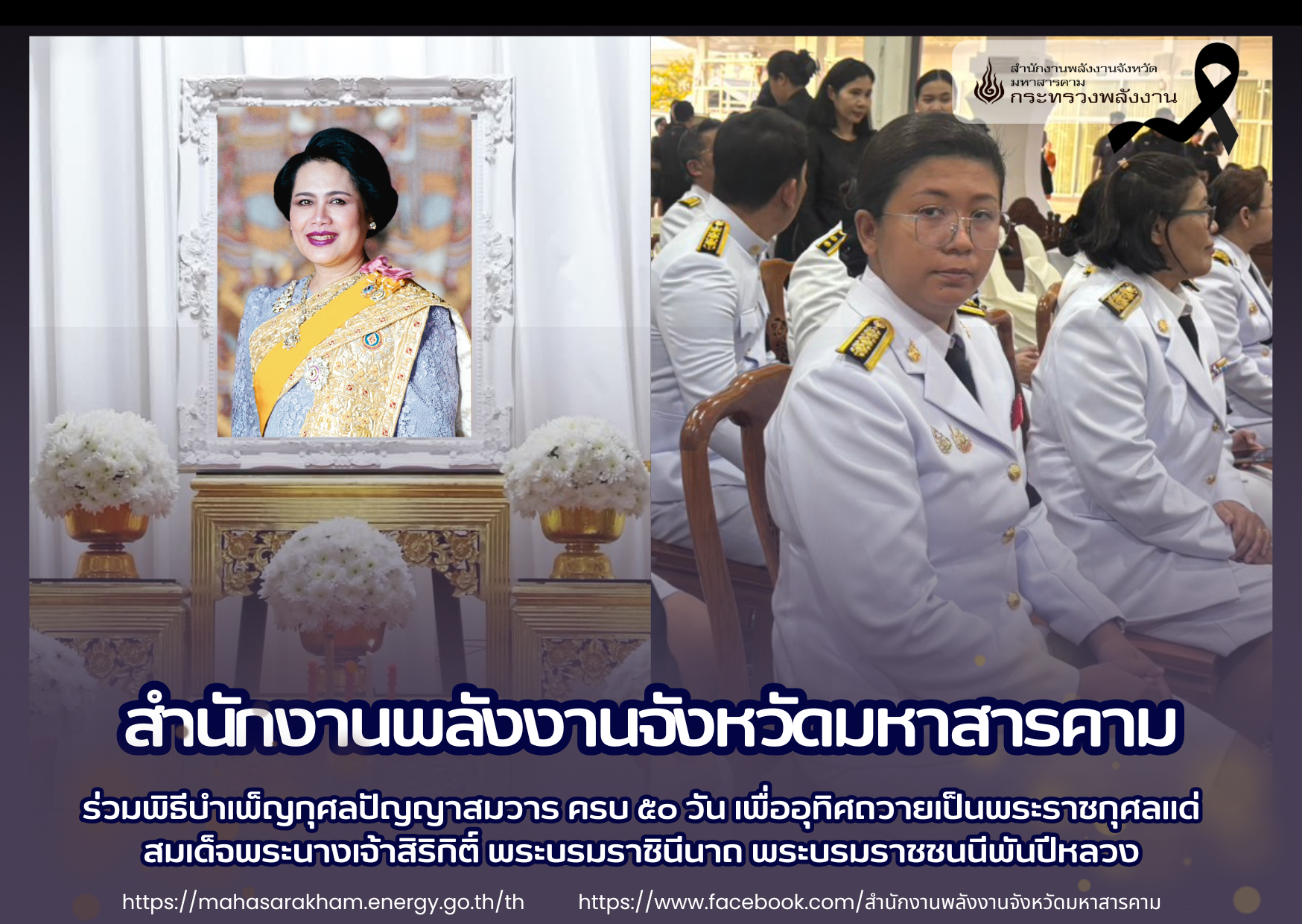 นางรัตนา ไชยดวงสี พลังงานจังหวัดมหาสารคาม มอบหมายให้นางสาวจุฬารัตน์ แสนวงษ์ วิศวกรปฏิบัติการ พร้อมด้วยเจ้าหน้าที่ประสานงาน กลุ่มส่งเสริมและกำกับกิจการพลังงาน สำนักงานพลังงานจังหวัดมหาสารคาม จังหวัดมหาสารคาม เข้าร่วมพิธีบำเพ็ญกุศลปัญญาสมวาร ครบ 50 วัน เพื่ออุทิศถวายเป็นพระราชกุศลแด่สมเด็จพระนางเจ้าสิริกิติ์ พระบรมราชินีนาถ พระบรมราชชนนีพันปีหลวง