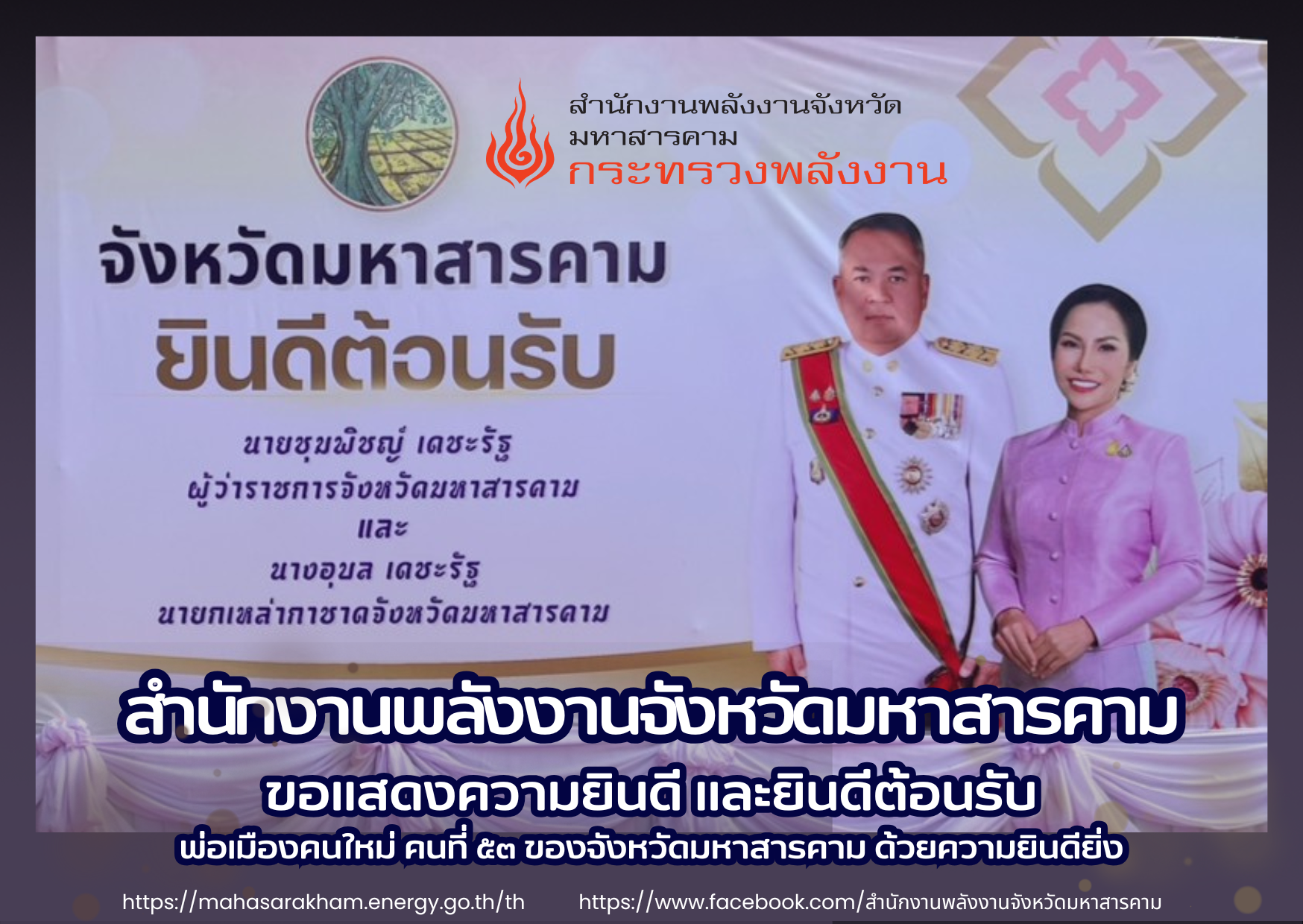 สำนักงานพลังงาน จังหวัดมหาสารคาม และชาวมหาสารคาม ขอแสดงความยินดี และยินดีต้อนรับ...นายชุมพิชญ์ เดชะรัฐ พ่อเมืองคนใหม่ คนที่ ๕๓ ของจังหวัดมหาสารคาม และนางอุบล เดชะรัฐ นายกเหล่ากาชาดจังหวัดมหาสารคาม ด้วยความยินดียิ่ง