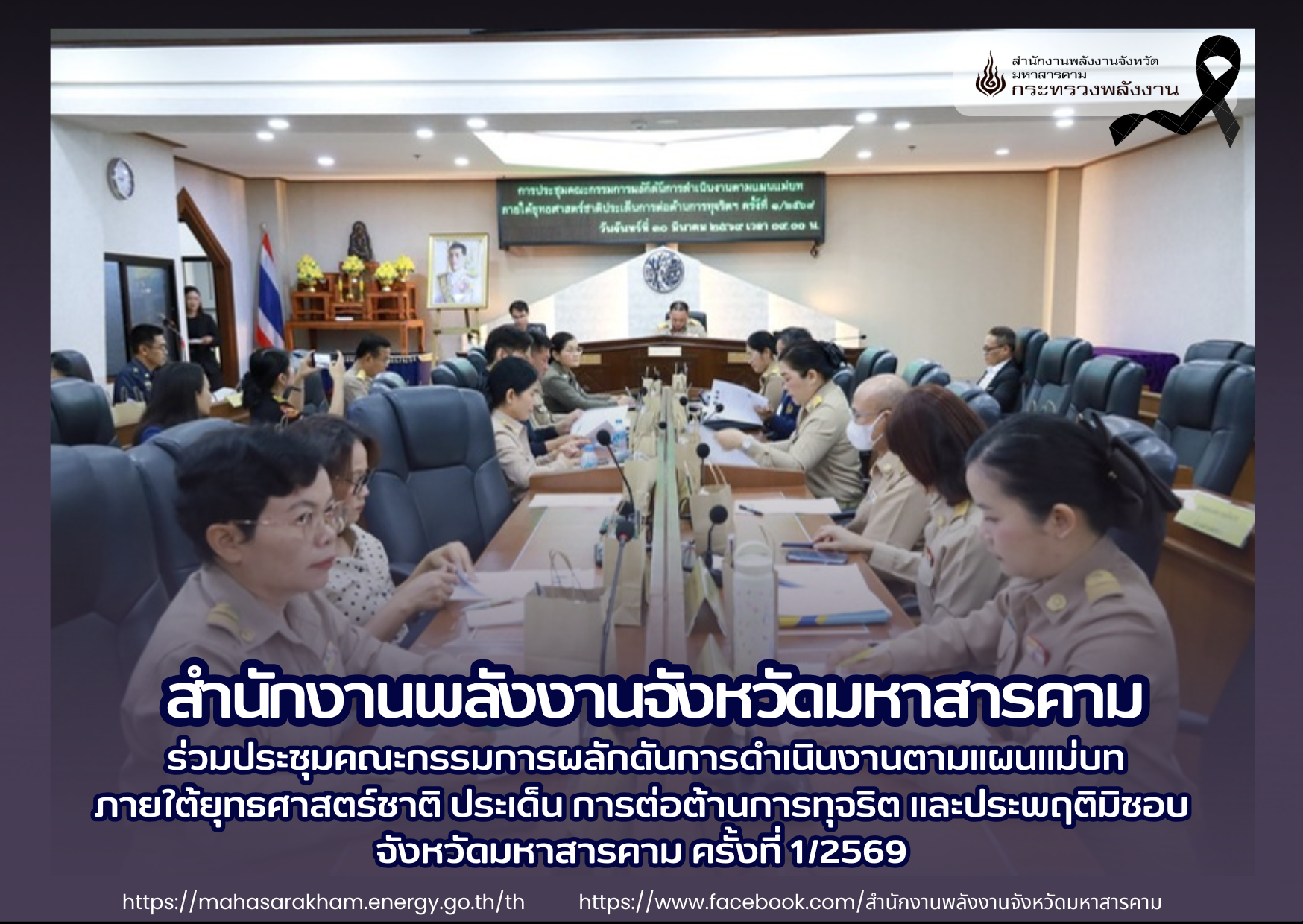 นางรัตนา ไชยดวงสี พลังงานจังหวัดมหาสารคาม มอบหมายให้นางสาวพิมพ์รวี ศิริสุรักษ์ นักจัดการวงานทั่วไปชำนาญการ กลุ่มอำนวยการและแผนพลังงาน สำนักงานพลังงานจังหวัดมหาสารคาม เข้าร่วมประชุมคณะกรรมการผลักดันการดำเนินงานตามแผนแม่บทภายใต้ยุทธศาสตร์ชาติ ประเด็น การต่อต้านการทุจริตและประพฤติมิชอบ จังหวัดมหาสารคาม ครั้งที่ 1/2569