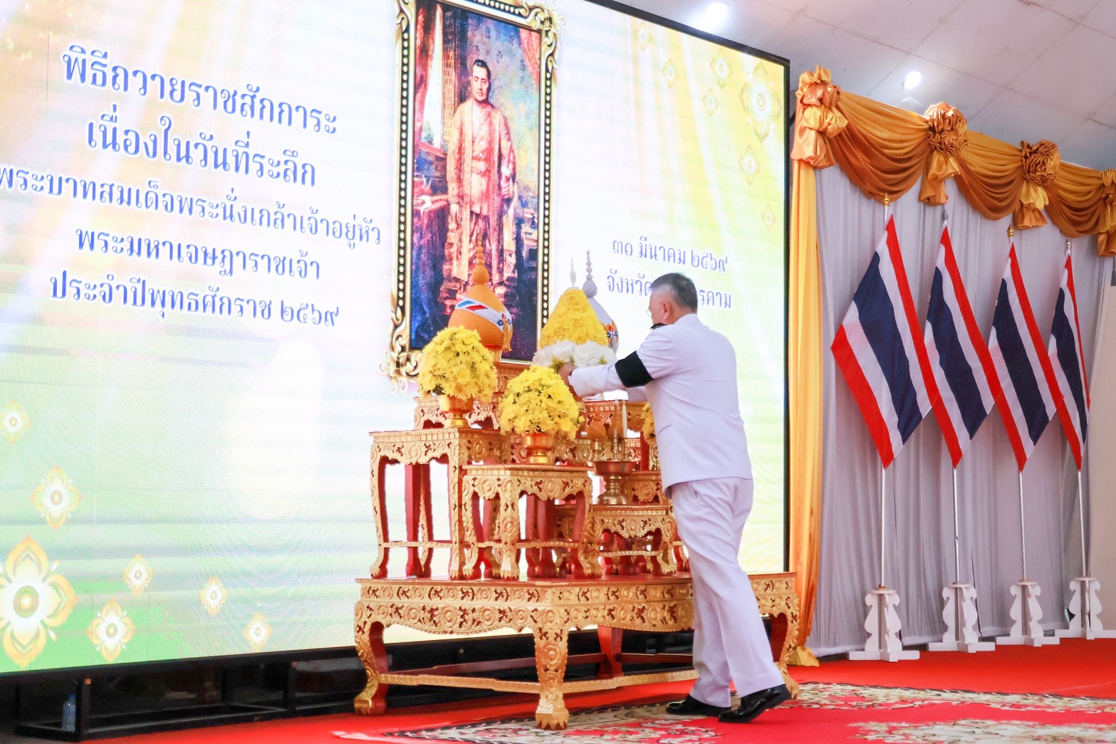 โดยมี นายชุมพิชญ์ เดชะรัฐ ผู้ว่าราชการจังหวัดมหาสารคาม เป็นประธานในพิธี พร้อมด้วย นายสมเกียรติ วิริยะกุลนันท์ นายกองเอกเสนีย์ มะโน รองผู้ว่าราชการจังหวัดมหาสารคาม หัวหน้าส่วนราชการ ข้าราชการ ศาล ทหาร ตำรวจ และประชาชน ร่วมประกอบพิธีวางพานพุ่มถวายราชสักการะ พร้อมกล่าวคำถวายราชสดุดีเฉลิมพระเกียติพระเกียรติฯ เบื้องหน้าพระบรมสาทิสลักษณ์พระบาทสมเด็จพระนั่งเกล้าเจ้าอยู่หัว พระมหาเจษฎาราชเจ้า